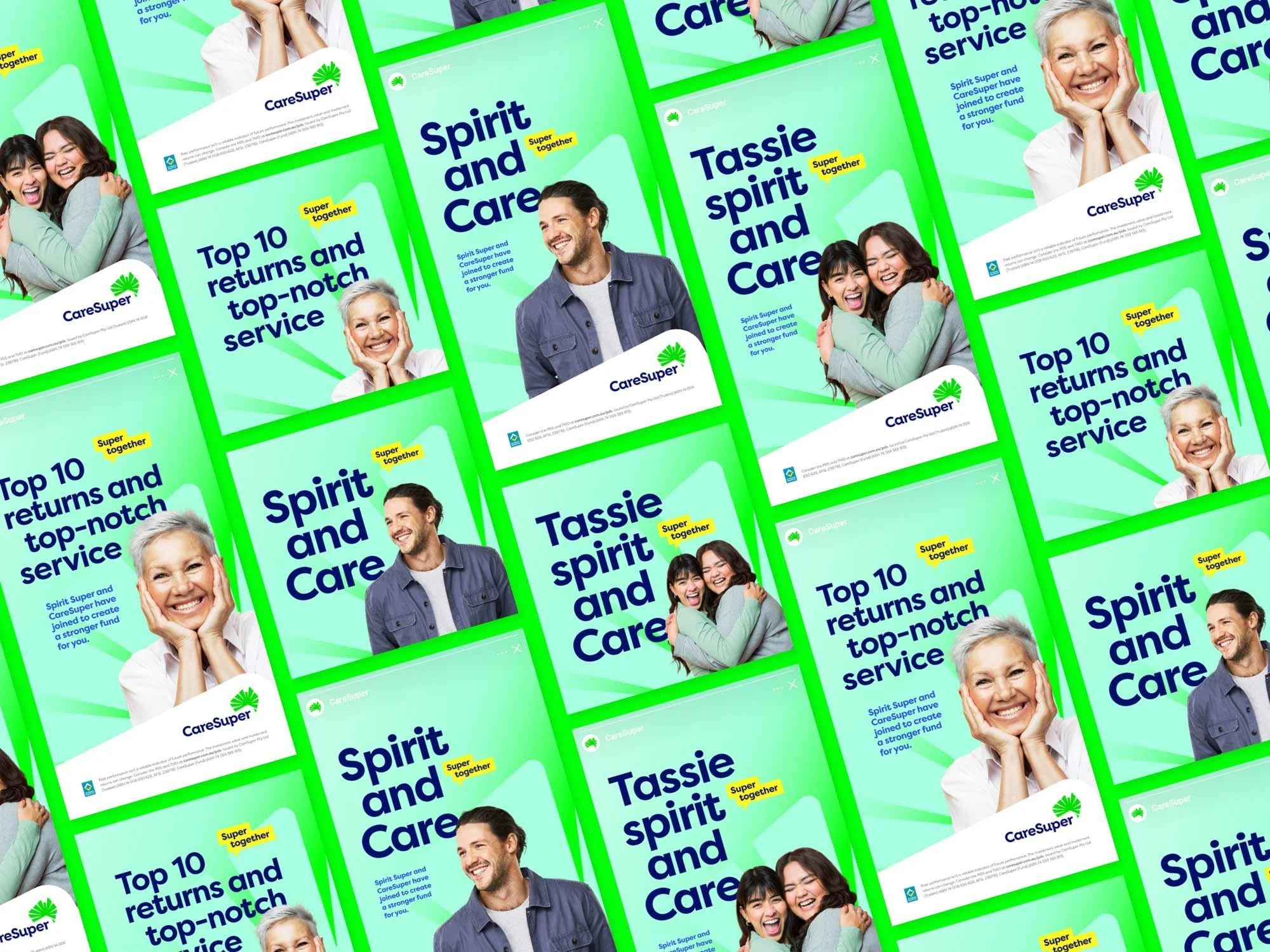 Our approach began with a deep dive into what made CareSuper and Spirit Super unique. We didn’t just want to blend their identities; we wanted to create a brand that felt inevitable—a natural evolution that both sets of members could rally behind. We revisited every aspect of their existing brands, from the visual elements to the core messaging, ensuring the new brand would feel fresh and familiar. The idea of “Super Together” became our guiding principle, a simple yet powerful concept that spoke to the strength found in unity. This wasn’t just about marketing; it was about creating a story that members could believe in.