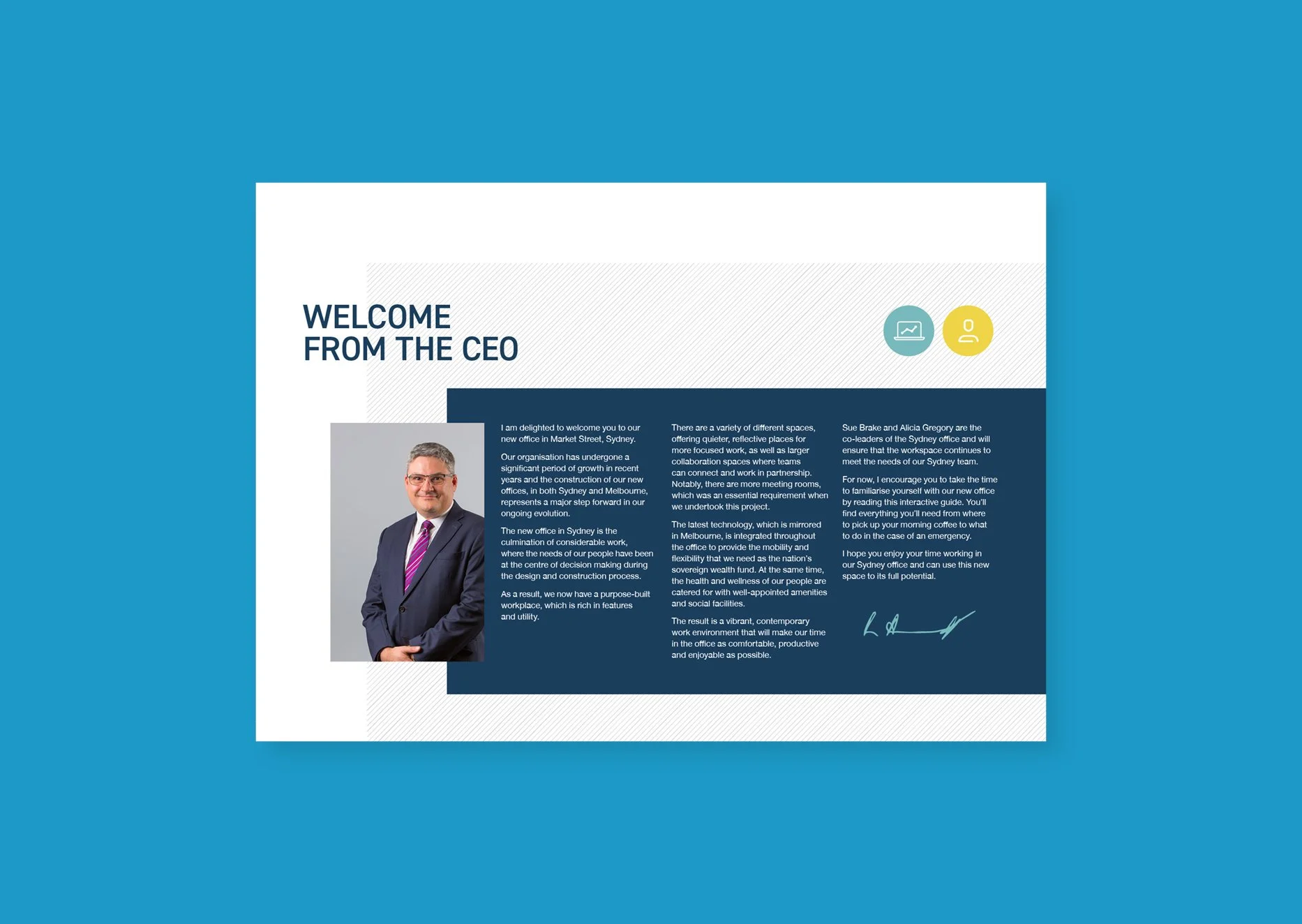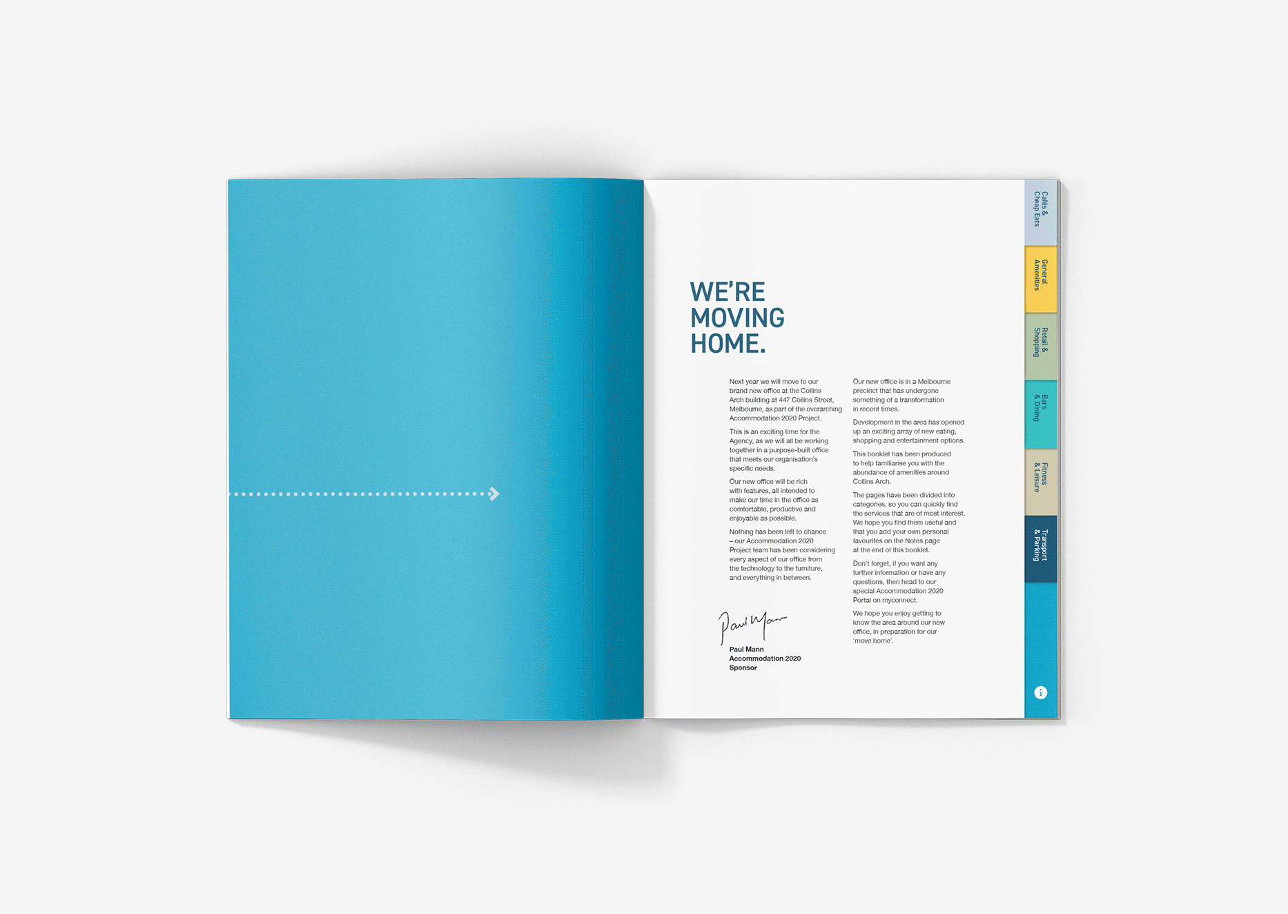 How did we do it? Introducing the Accommodation 2020 project, or “A2020” for short—a unifying identity that coloured communications throughout the year. With its vibrant and informal expression, this internal identity seamlessly complemented the conservative external brand style. We launched the new look at the announcement event across branded t-shirts, environmental graphics, and a printed pocket guide, inspiring staff to explore their new ‘hood. Smoothly transitioning staff was our priority, and we also delivered two interactive PDF workplace guides. The first covered every aspect of induction, while the second, a light-hearted etiquette companion, illustrated behaviours to embrace and avoid in the workplace. After all, who doesn’t like good neighbours?