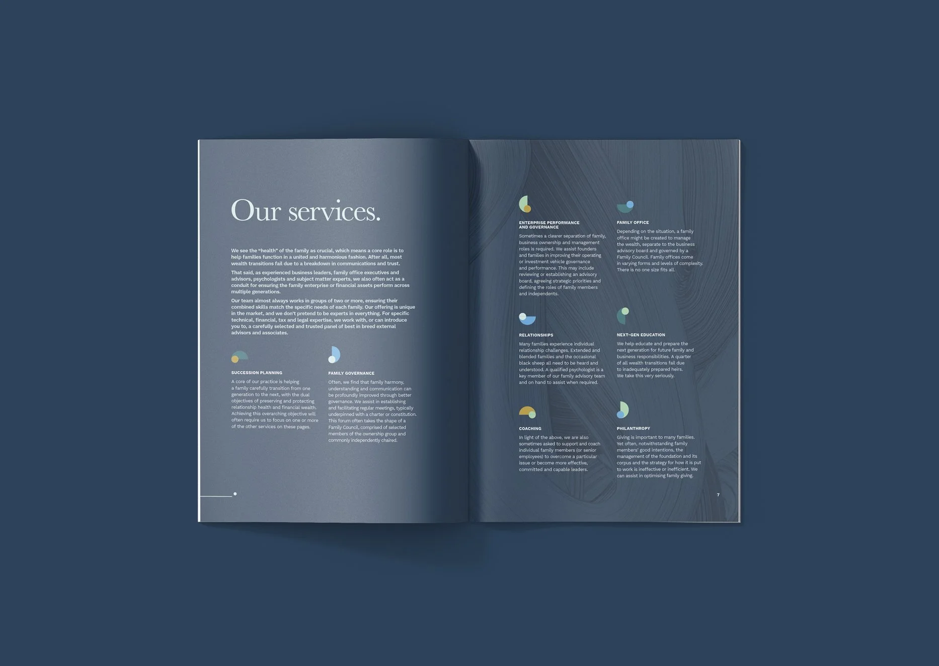 Through a series of interviews, we worked closely with Pointmade to articulate their offer, services, processes, and team, capturing it eloquently in copy. Building upon their logo and primary colour, we crafted a comprehensive visual identity with an elegant yet modern feel. This encompassed an expanded colour palette featuring complementary blues and greens, contrasting mustard, an ownable swirling painted brush texture, and custom photography. Our identity system seamlessly traversed their touchpoints, from brochures and websites to event booths and digital questionnaires. All these elements were pivotal in expanding Pointmade’s reach and reinforcing its bespoke approach to advising high-net-worth clients.
