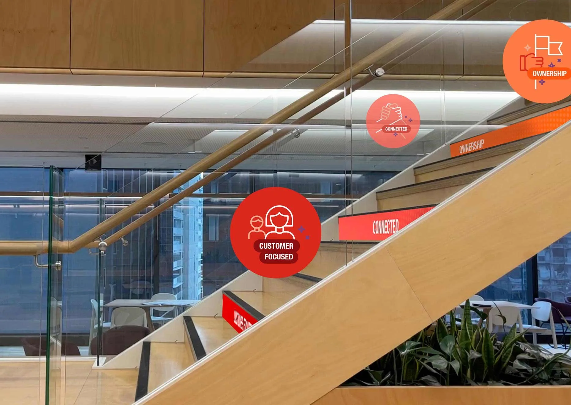 Our solution involved strategically blending messaging and visuals to provide a unique employee expression of the TelstraSuper Masterbrand. Featuring authentic staff as the faces of our creative concept, we gave a genuine voice to the essence of the EVP and values. The meticulous process, from scripting and storyboard animatics to group buy-in before shooting, resulted in a vibrant, professionally branded video – a valuable asset for long-term use. Additionally, we designed and installed thoughtfully crafted decals throughout the TelstraSuper office to extend the impact beyond the digital realm and into the physical workspace.