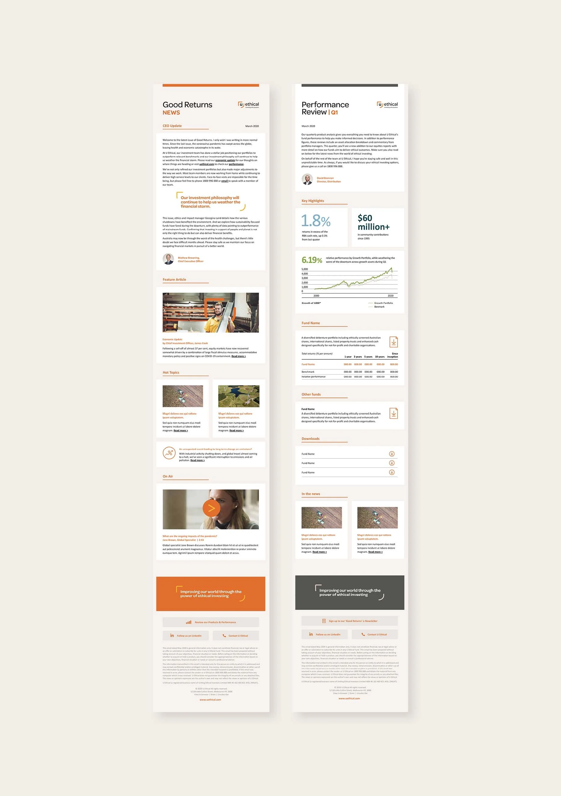 U Ethical prioritises consistent communication with investors through two vital e-newsletters, focusing on ethical matters and fund performance. However, over time, these documents displayed signs of wear and aging as they navigated through various hands. The physical stress of bending, stretching, and multiple saves compromised their original integrity. Our mandate was to breathe new life into both templates, instilling a renewed trust and professionalism. The overarching goal was to ensure their sustained effectiveness and durability as they circulated.